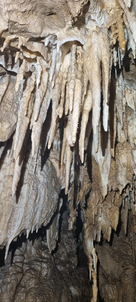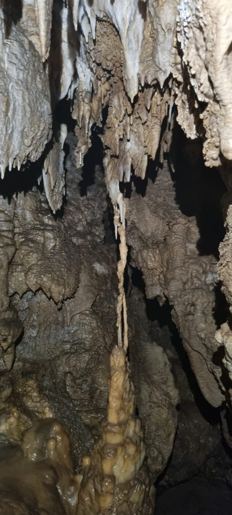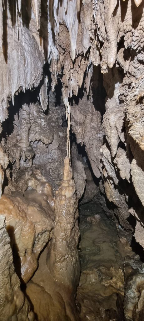 Quindi, scendiamo da un ultimo saltino e proseguiamo attraverso qualche passaggio un po’ più stretto, per arrivare ad un piccolo pianerottolo in cui è possibile appena sedersi all’asciutto, infatti verso le pareti piove.