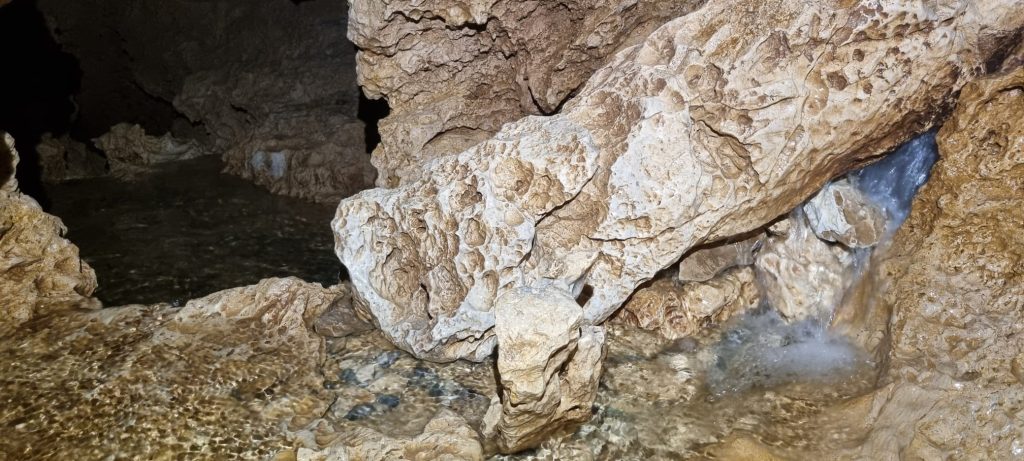 Il rumore dell’acqua è talmente alto che per parlarci dobbiamo urlare. Ci accompagnerà per il resto dell’uscita rimanendo un rumore di fondo incessante, un altro compagno di grotta.
