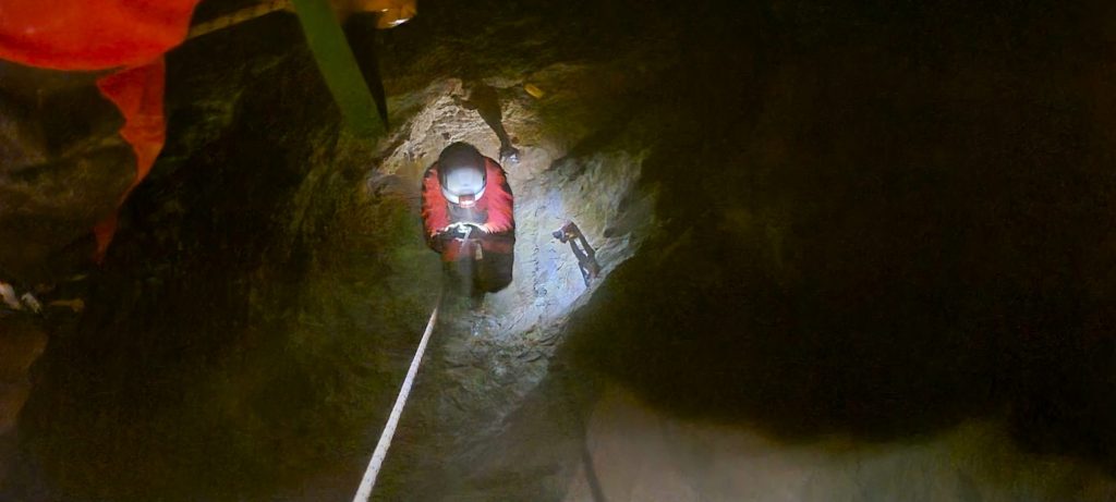 Continuiamo con questa danza del pendolo e tiro alla fune per diversi pozzetti, intervallati da qualche tratto in libera e un paio di traversi piuttosto antipatici.